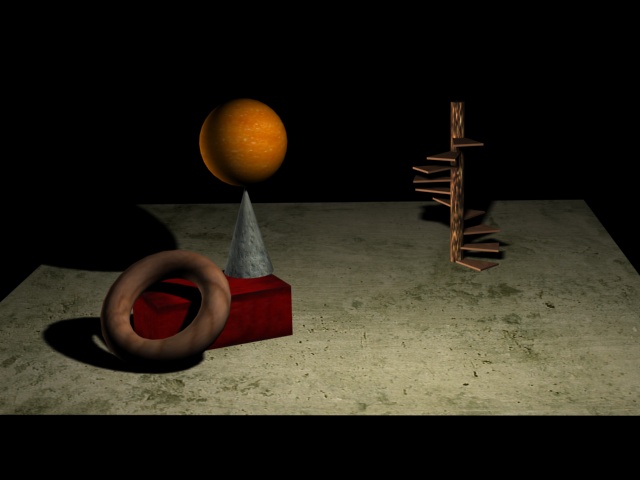 Platzieren sie mindestens 3 verschiedene Objekte so übereinander, dass der Eindruck entsteht, sie würden aufeinander liegen bzw. balancieren. Eine „Wendeltreppe“ soll ebenfalls (zusätzlich zu den 3 Objekten) vorhanden sein. Meine Lösung: