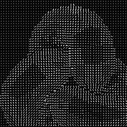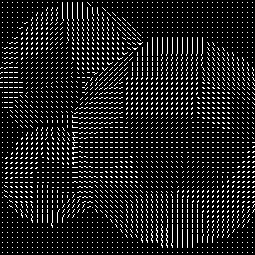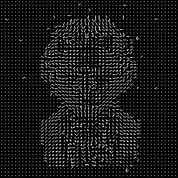 A needle map is used to represent the gradients. Not every point is drawn with its correspondent representation of the gradients (basically a line), but only some of them. Those are regularly chosen from the original dataset by applying a grid an the image. The grid width is 5 pixel because with fewer data samples the representation wouldn't clearly visible (a loss of information). On the other hand it has shown from testing that too many gradients represented in the image only confuse the viewer and hide information.