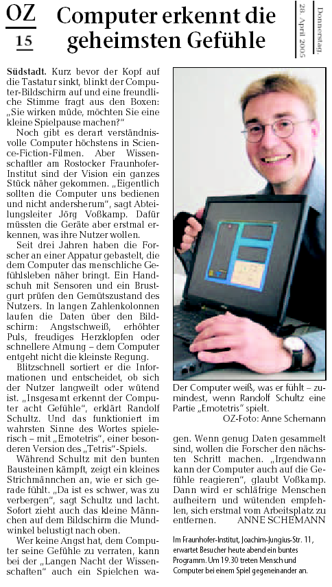 Um zu ergründen, ob bestimmte Gesichtsausdrücke zur Kommunikation bestimmter Gefühle geeignet sind, habe ich einen Nutzertest entworfen, implementiert, durchgeführt und ausgewertet. Er ist in den o.g. Dokumenten beschrieben. Wer ihn 'live' sehen möchte (die Funktionalität ist nur noch durch die Beispielseiten erfahrbar), kann ihn über diesen Link zur Startseite nochmal anschauen, oder auch das komplette Paket mit allen Dateien herunterladen.